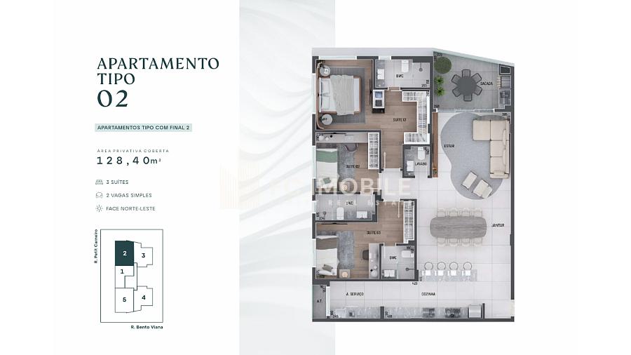 - Ambientes: O apartamento conta com 3 suítes, sendo a suíte máster equipada com um amplo closet, garantindo privacidade e praticidade. Além disso, inclui uma cozinha moderna, sala de estar, sala de jantar e um living acolhedor que se integra perfeitamente aos espaços.