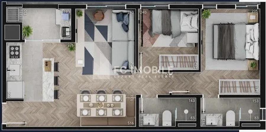 O apartamento conta com 52 m² de área privativa e 88 m² de área total, oferecendo um ambiente acolhedor e funcional. Com uma planta inteligente, a cozinha se integra à sala de estar e jantar, criando um espaço arejado e perfeito para convívios. A sacada com churrasqueira é ideal para reunir amigos e familiares em momentos de descontração.